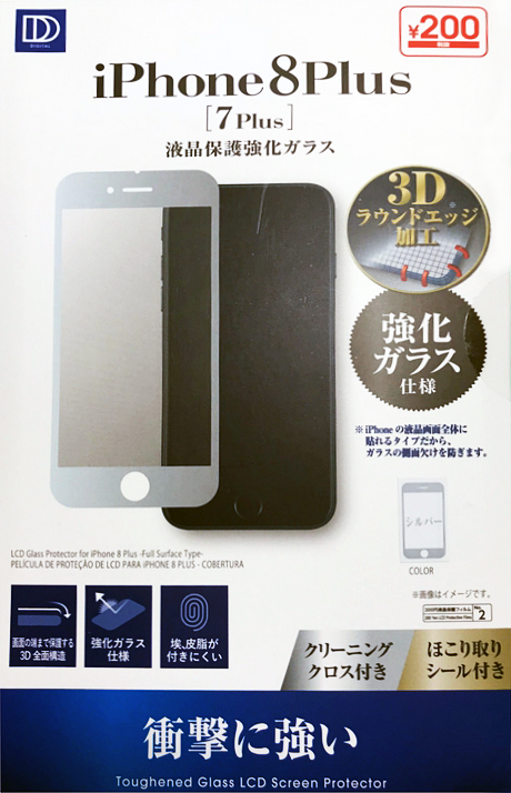 今まで100円ショップでは見たことの無い全面保護タイプ、3Dラウンドエッジ加工の強化ガラス。価格はちょい高の¥200。画面枠部のカラーはシルバー、ガンメタ、ローズゴールド、ゴールドの4色で、なぜかブラックがないのが残念だがガンメタをチョイス。